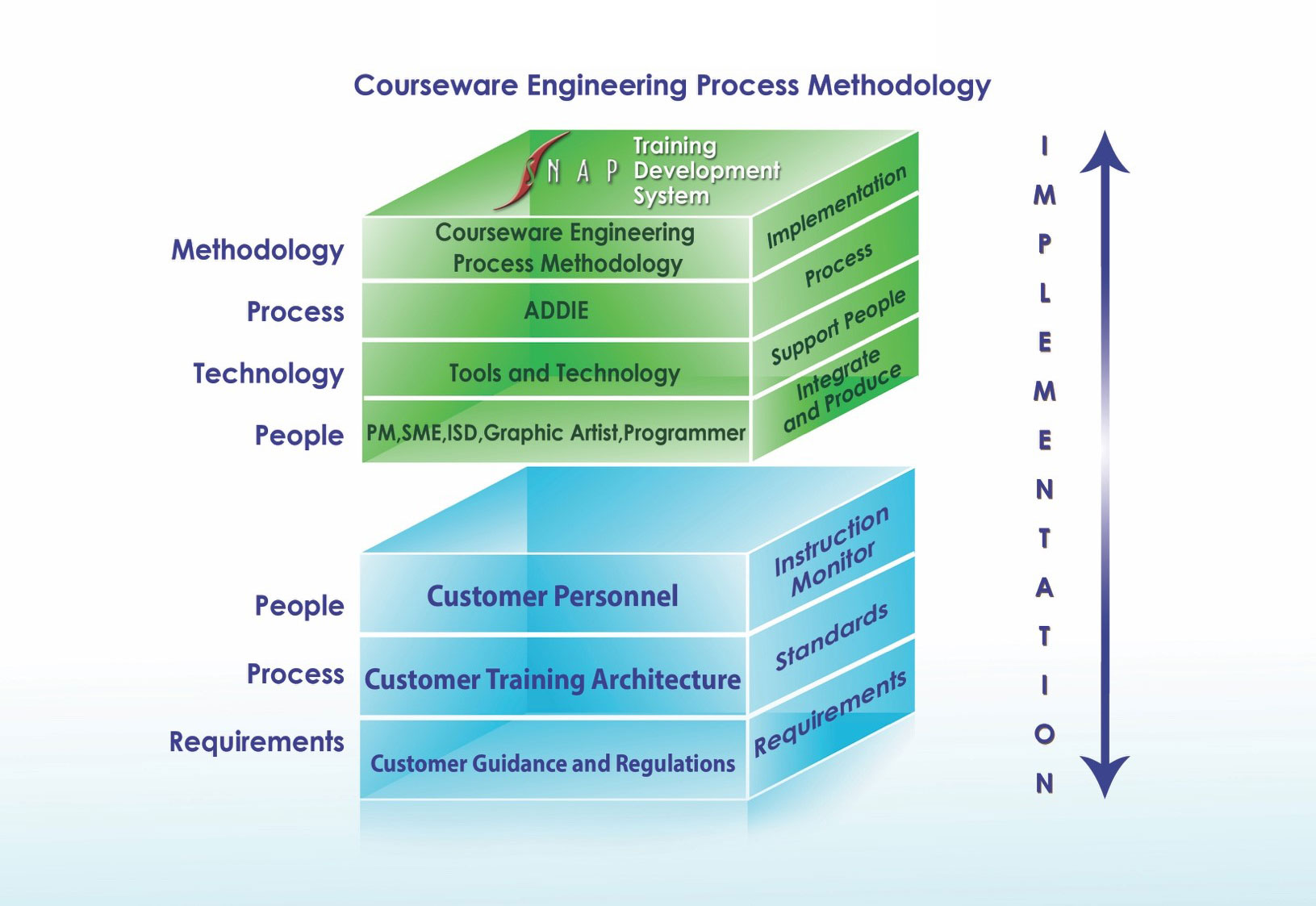 The key to our methodology is our integrated product team (IPT) approach, comprised of SNAP management and team members, customer stakeholders, governance, doctrine, and contracting representatives. We involve and engage our customers to cultivate growth, manage change, and ensure quality through collaboration with our highly qualified training staff. We design, update, revise, develop, test, and field synchronous and asynchronous instructional materials with interactivity ranging from Levels 1-4. SNAP uses our proprietary Courseware Engineering Process (CEP) methodology to rapidly generate and update quality learning content and manage team efforts. In this approach, all SNAP team members are familiar with the CEP methodology because it includes elements of familiar and standard methodology for the purpose of courseware development, updates, revisions, and delivery of customized learning solutions.